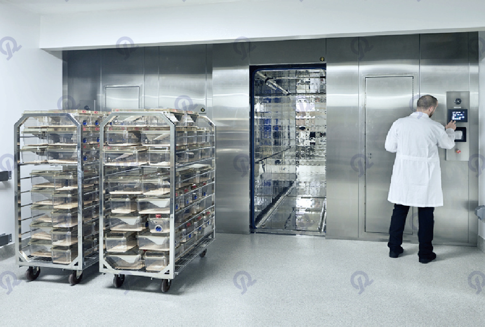 根據(jù)進入SPF級動物房的各種物品的不同特性,選擇不同的消毒方法。飼養(yǎng)籠盒、飲水瓶、墊料、衣服和各種實驗用具采用高壓蒸汽滅菌器消毒;動物食用飼料采用放射性照射(60co)的消毒方法;工作人員用的拖鞋等采用渡槽浸泡的方法(0.5%滅菌凈溶液)消毒;對于不耐熱、不耐水、不耐酸堿和不能進行放射性照射的物品采用傳遞窗紫外線消毒。實驗室動物飼養(yǎng)室的平面尺寸根據(jù)飼養(yǎng)量、飼養(yǎng)方式,籠具架規(guī)格、排列方式、室內(nèi)環(huán)境、飼養(yǎng)管理及操作方式等綜合研究確定。為了避免溫、濕度在垂直方向出現(xiàn)梯度,籠架高度不宜超過1.8米,頂棚高應(yīng)在2.2~3米范圍內(nèi)。走廊寬度要便于操作和搬運物料及器材,以不小于1.3米為宜。清潔準(zhǔn)備室的大小,須根據(jù)作業(yè)內(nèi)容和消毒滅菌裝置等設(shè)施占用的空間確定。清潔準(zhǔn)備室、清潔走廊同洗滌室以墻壁隔開,墻壁絕不允許出現(xiàn)裂縫。