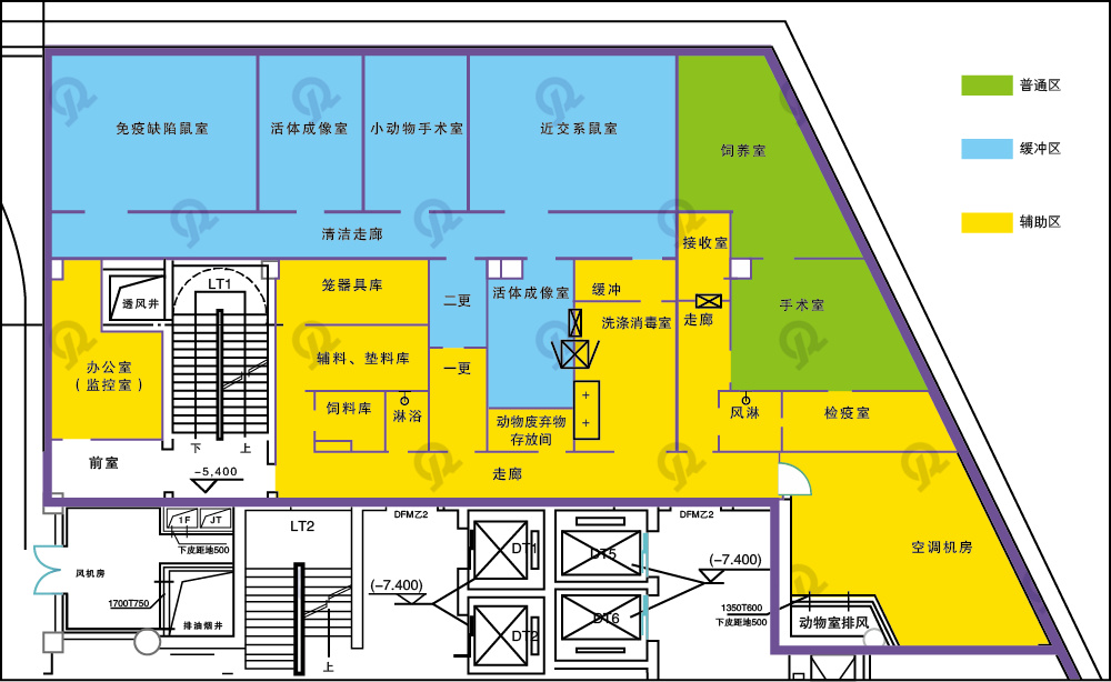 嚴(yán)格遵循單向流動的原則。人員流向:外環(huán)境一第一更衣一淋浴一第二更衣一風(fēng)淋一潔凈走廊一實驗室一次潔凈走廊一緩沖間一外環(huán)境動物流向:購買SPF級動物一檢疫/觀察室一實驗室一次潔凈走廊一緩沖間一解剖室物品流向:洗消間一高壓滅菌設(shè)備/渡槽/傳遞窗一消毒物品儲存室一實驗室一次潔凈走廊一緩沖間一外環(huán)境。