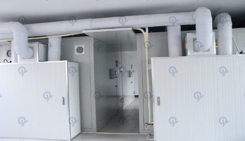 人工氣候實驗室由控制室、空氣處理室和環境實驗室三部分組成控制室內裝有控制各種因素的調節器和巡測器,調節器指示所需要的各種環境因素的正定值,并根據巡測器連續不斷地檢測環境實驗室的實際值與正定值之間的偏差,自動發出動作信號分別傳遞給各種執行機構(如熱源、冷源、光源、氣體成分控制系統)進行動作;空氣處理室內裝有空氣過濾器、熱源、冷源、除濕器、加濕器等設備,這些設備按控制室內調節器的指令動作;環境實驗室內裝有電光源和監測光、溫度、濕度、氣體成分等因素的感應元件,并與巡測器相連接,將各感應到的實際值傳給巡測器轉到控制室的調節器上進行偏差識別。按此路線反復循環使環境實驗室中的實際值與調節器上的正定值相同。人工氣候室常用于研究環境條件對生物生命活動的影響,也可用于某些生物的栽培、馴化、育種等工作。其規模及可控條件則根據需要確定。