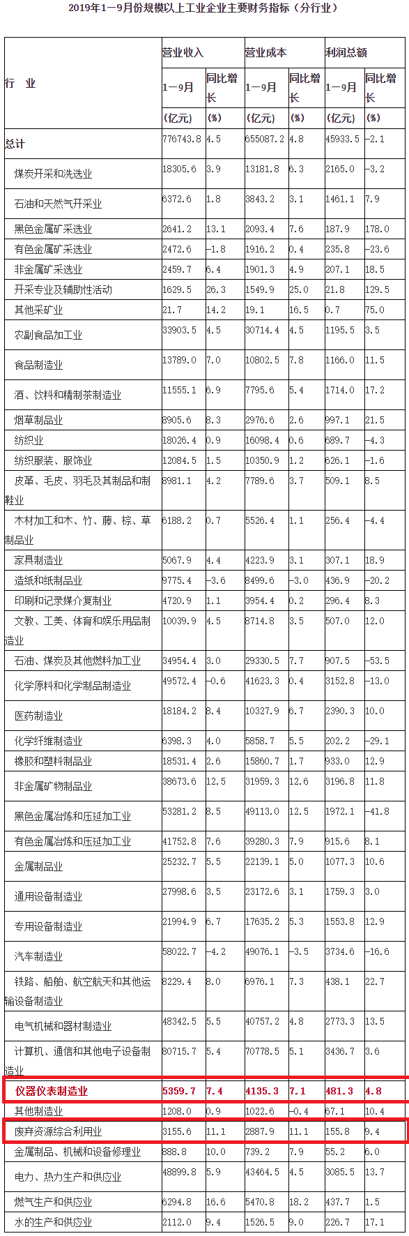 國家統計局:1-9月,儀器儀表制造業、廢棄資源