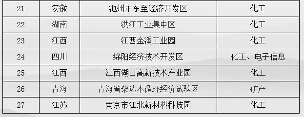 入圍的化工園區有:上海化學工業區、四川什邡經濟開發區、安慶市高新技術產業開發區、姚家港化工園、宜都高新技術產業園、祥云財富工業園、連云港徐圩新區、江西德安工業園、泰興經濟開發區、荊門化工循環產業園、江西新干工業園、貴州福泉經濟開發區、池州市東至經濟開發區、洪江工業集中區、江西金溪工業園、綿陽經濟技術開發區、江西湖口高新技術產業園、南京市江北新材料科技園。