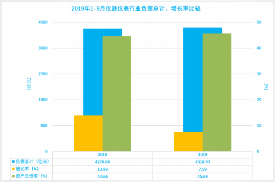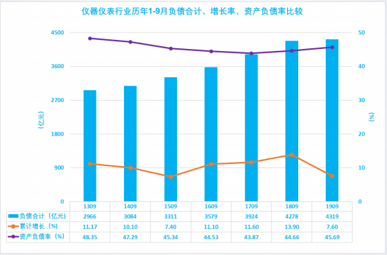 2.10 儀器儀表行業歷年1-9月負債合計、增長率、資產負債率比較