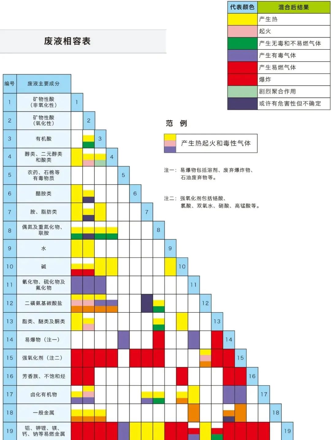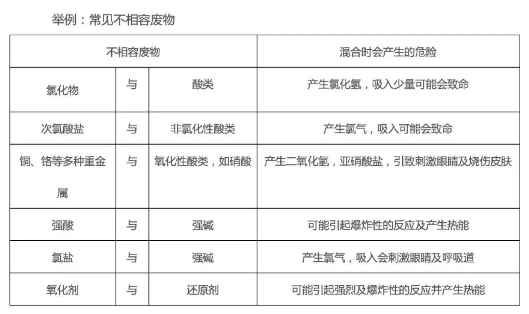 6、廢物相容原則:同一性質或類別的相容廢物可以收集在同一容器內。能夠發生反應的不同廢物不能裝在同一容器或同一包裝物內。即同一包裝容器、包裝袋不能同時裝盛兩種以上的不同性質或類別的危險廢物。不相容的廢物應該分別收集在不同的廢物容器內。不相容廢物(能夠發生反應的廢物)的收集容器也不可混合在一起存放。