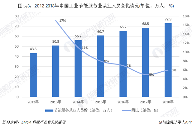 據(jù)中國節(jié)能協(xié)會(huì)節(jié)能服務(wù)產(chǎn)業(yè)委員會(huì)(EMCA)公布的統(tǒng)計(jì)數(shù)據(jù)顯示,2012-2018年中國節(jié)能服務(wù)產(chǎn)業(yè)從業(yè)人員呈現(xiàn)上升趨勢。2018年中國節(jié)能服務(wù)人員達(dá)到72.9萬人,較2017年增長6%。節(jié)能服務(wù)產(chǎn)業(yè)作為朝陽行業(yè),吸引著眾多投資者和從業(yè)者。