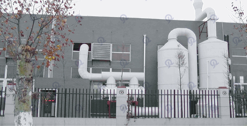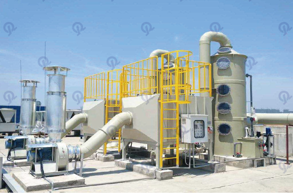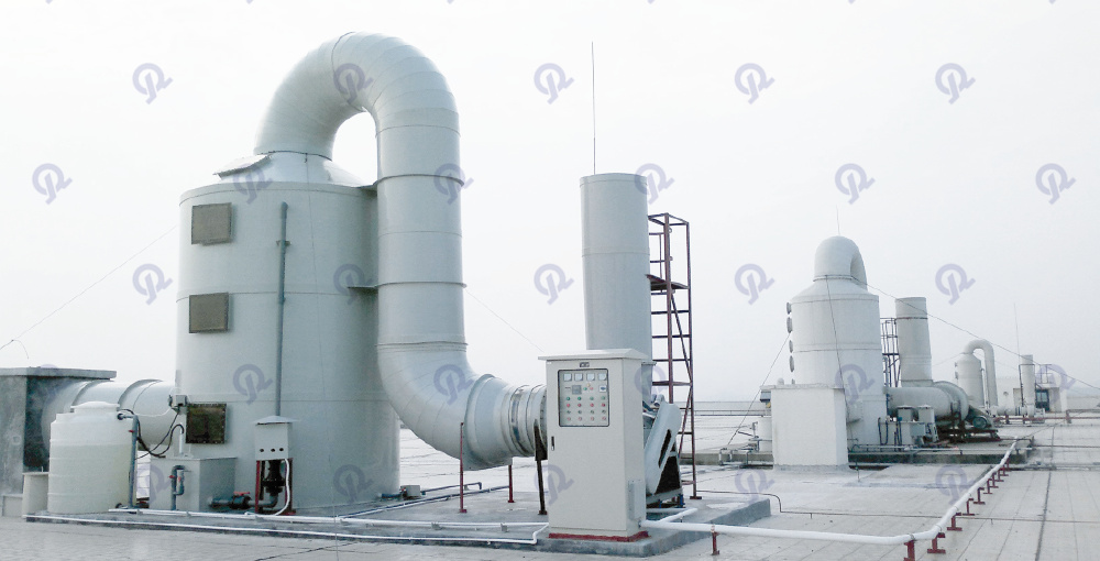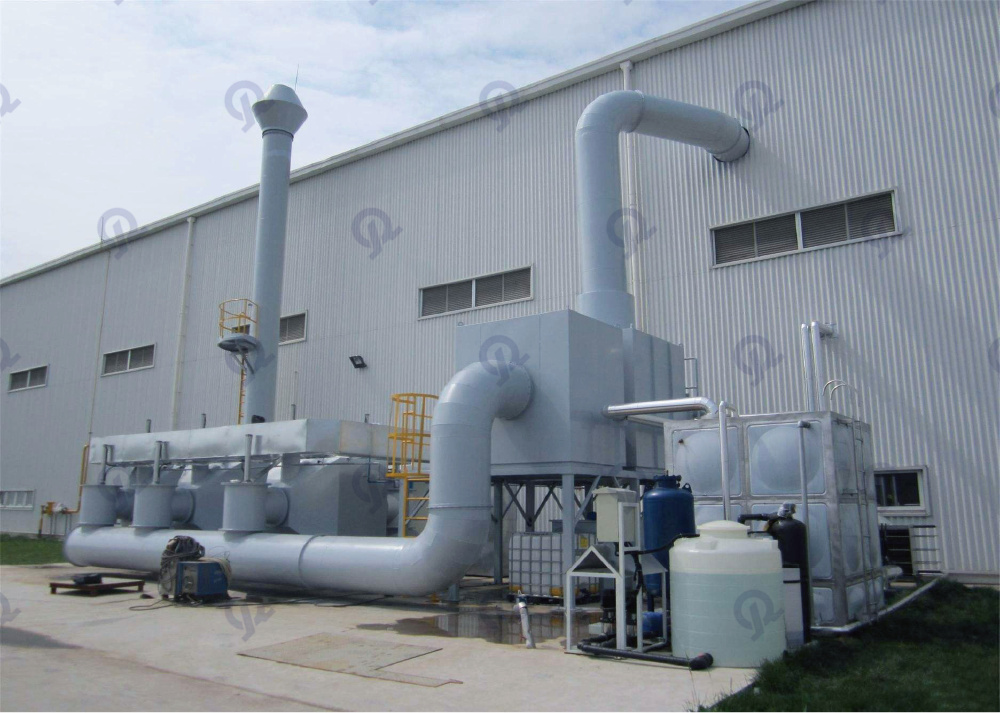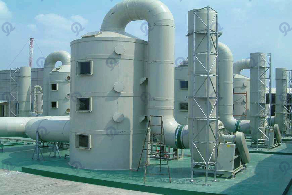 噴淋洗滌塔主要由主筒體、上部噴淋盤、中部填料、下部噴淋盤、清理孔、視鏡孔等組成,其工作原理是:在引風機的負壓作用下,廢氣氣流被吸入進風管道并送入塔體。塔的主體是一個圓形筒體,洗滌液(氫氧化鈉溶液)從洗滌塔上部噴淋盤射入筒內,使整個筒體的填料與水混合形成霧狀洗滌液水膜從上而下流動(填料在氣流的作用下不停翻滾,使廢氣與洗滌液充分混合)。在負壓的作用下廢氣在筒體內旋轉上升,并始終與筒體內的洗滌液水膜發生摩擦,這樣酸性氣體被洗滌液水膜充分濕潤、中和。在筒體底部設有清理孔便于進行筒體底部清理,而洗滌液則通過儲液箱(水箱)在水泵的作用下不斷循環,從而達到消除廢氣的效果。